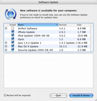 MacFixit on 10.3.5 upgrades. I need to do the upgrade, just get it over with. But looking at my Software Update pane, I'm perplexed... I mean, how did I miss multiple iPhoto updates? Will upgrading expose some corruption in the state of SWUpdate's database? Didn't I install iLife 04 when I did my rebuild? That might explain why I had such slow reimport.....